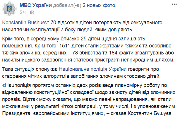 Об этом заявил передает председатель Национальной полиции Украины Константином Бушуевым. Его слова цитирует пресс-служба ведомства.