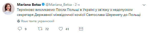 "Срочно вызываем посла Польши в Украине в связи с недопуском секретаря Государственной межведомственной комиссии Святослава Шереметы в Польшу", - написала Беца.