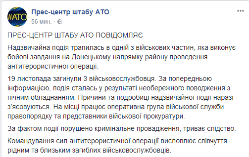 "19 ноября погибли три военнослужащих. По предварительной информации, это случилось в результате неосторожного обращения с печным оборудованием. Причины и подробности чрезвычайного происшествия выясняются. На месте работают оперативная группа военной службы правопорядка и представители военной прокуратуры", – говорится в сообщении.