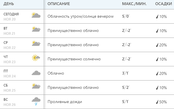 Сайт Weather.com обещает солнечный четверг, проливной дождь в воскресенье и переменную облачность в остальные дни. В понедельник и выходные днем +5, со вторника по пятницу +2...+3.
