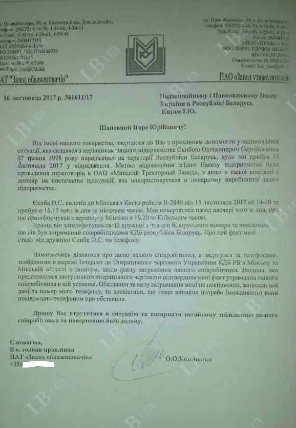 В письме на имя посла Украины в Беларуси Игоря Кизима от 16 ноября утверждается, что директор ПАО "Завод утяжелителей" Скиба Александр Сергеевич (7 мая 1978 года) прибыл в Минск 15 ноября в командировку на переговоры с ОАО "Минский тракторный завод", с которым украинское предприятие имеет договор о поставках продукции в литейном производстве белорусского завода.,
