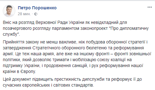 Петр Порошенко предлагает Верховной Раде рассмотреть законопроект о дипломатической службе как неотложный. Об этом президент сообщил в Facebook.