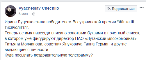 "Ирина Луценко стала победителем Всеукраинской премии "Женщина III тысячелетия". Теперь ее имя навсегда вписано золотыми буквами в почетный список, в котором уже фигурируют директор ПАО "Луганский мясокомбинат" Татьяна Молчанова, советник Януковича Ганна Герман и другие выдающиеся личности.