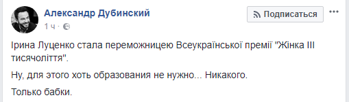 Журналист Александр Дубинский почему-то уверен, что решающую роль в победе Луценко сыграли деньги, а также шутит на тему отсутствия у ее мужа-генпрокурора юридического образования.