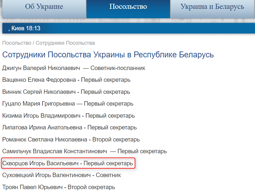 Отметим, что на сайте украинского посольства в РБ Скворцов уже исчез, но в кеше Google он остался.