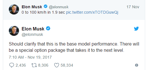 По словам Маска, специальная версия Tesla Roadster "выведет показатели динамики на новый уровень". Об этом он написал в своем Twitter.