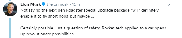 Элон Маск пообещал, что новый Roadster от Tesla "будет летать"