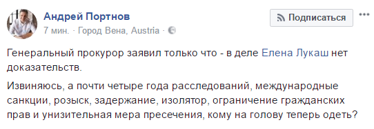 "Извиняюсь, а почти четыре года расследований, международные санкции, розыск, задержание, изолятор, ограничение гражданских прав и унизительная мера пресечения, кому на голову теперь одеть?", - написал он в Facebook.