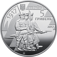 На аверсе монеты размещены: вверху малый Государственный Герб Украины, справа от которого надпись Украина, под которым-номинал и год чеканки монеты - 5/гривень/2017; в центре-стилизованная композиция, выдержанная в стилистике украинского авангарда начала ХХ века - солдаты в мундирах различных военных формирований времен Украинской революции, один из которых держит флаг, на котором надпись 1917; внизу - логотип Банкнотно-монетного двора Нацбанка.
