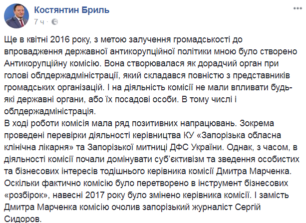 "Со временем, в деятельности комиссии начали доминировать субъективизм и сведения личных и деловых интересов тогдашнего руководителя комиссии Дмитрия Марченко. Поскольку фактически комиссия была преобразована в инструмент бизнес "разборок", весной 2017 были изменены руководителя комиссии. И вместо Дмитрия Марченко комиссию возглавил запорожский журналист Сергей Сидоров", - пишет председатель Запорожской облгосадминистрации.