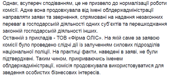 Он утверждает, что комиссия продолжала от имени облгосадминистрации направлять заявления и обращения, направленные на предоставление незаконных преимуществ в хозяйственной деятельности одних субъектов и препятствование законной хозяйственной деятельности других.
