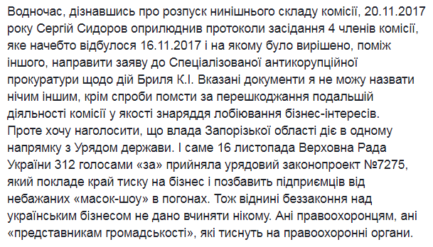 Он добавил, что если органы, к которым направлены заявления о совершении председателем Запорожской ОГА уголовных правонарушений, их не будут рассматривать из-за распоряжения Брыля об отмене комиссии, Сидоров их продублирует как физическое лицо.