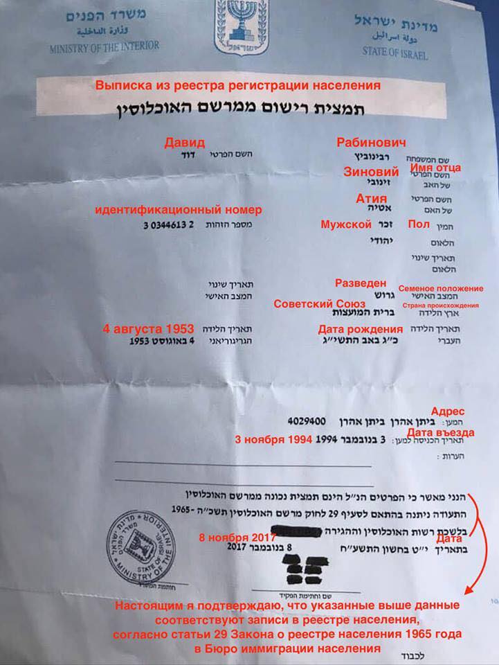 Не так давно блогер Василий Крутчак (у него с Рабиновичем острый конфликт - политик обвиняет его в организации покушения на себя, а Крутчак Рабиновича - в мести за критические публикации) опубликовал копии документов из МВД Израиля, где Рабинович якобы зарегистрировался еще в 1994 году, когда репатриировался вместе с женой. Потом ей и детям дали гражданство, автоматически израильский паспорт выдали и Рабиновичу. Причем, если верить блогеру, в новом гражданстве Рабинович принял имя Давид.