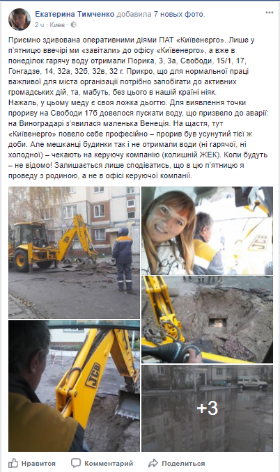 "Приятно удивлена оперативными действиями ПАО "Киевэнерго". Только в пятницу вечером мы "посетили" офис "Киевэнерго", а уже в понедельник горячую воду получили Порика, 3, 3а, Свободы, 15/1, 17, Гонгадзе, 14, 32а, 32б, 32в, 32 г. Жаль, что для нормальной работы важной для города организации нужно прибегнуть к активным общественным действиям, и, видимо, без этого в нашей стране никак", - отметила Тимченко.