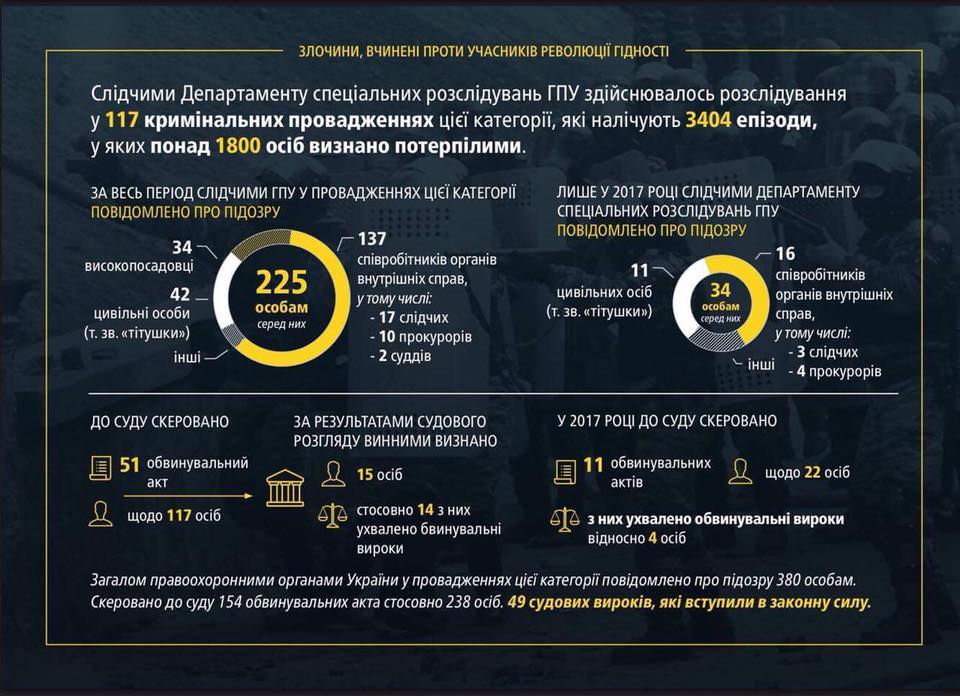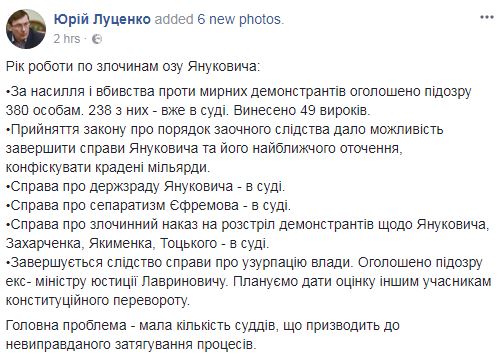 "За год работы по преступлениям "ОПГ Януковича", по делам о насилии и убийстве мирных демонстрантов Майдана объявлено подозрение 380 лицам, 238 из этих дел – в суде, вынесено 49 приговоров", - пишет Луценко.