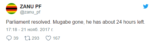 Об этом он заявил в письме. По данным спикера, Мугабе написал, что  оставляет свой пост, чтобы обеспечить плавный переход власти. В письме говорится, что Мугабе добровольно согласился уйти в отставку.