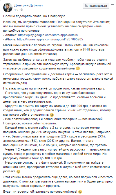 Команда бывших топ-менеджеров Приватбанка запустили первый мобильный банк Monobank, который не предполагает ни одного отделения. Об этом сообщил соучредитель проекта Дмитрий Дубилет на своей странице в Facebook