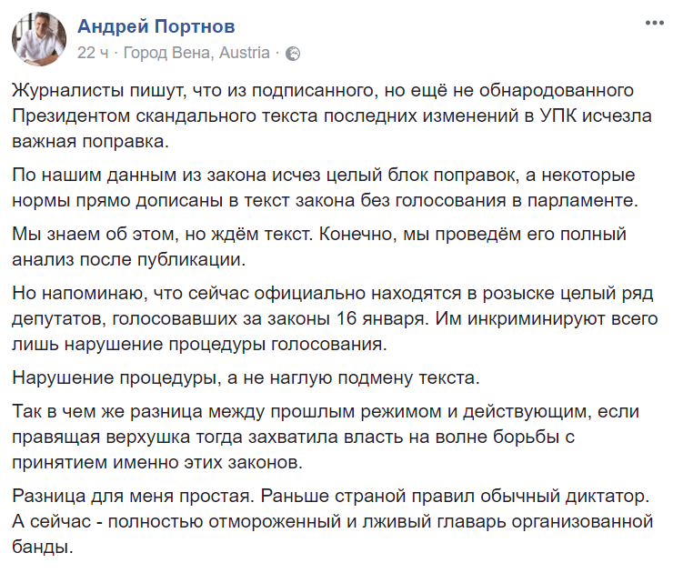 "По нашим данным из закона исчез целый блок поправок, а некоторые нормы прямо дописаны в текст закона без голосования в парламенте. Мы знаем об этом, но ждём текст. Конечно, мы проведём его полный анализ после публикации", - написал Портнов в Facebook.