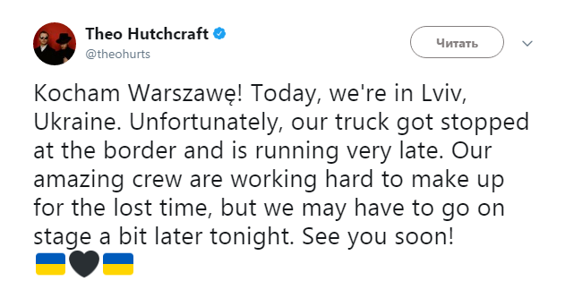 "Варшава, я тебя люблю!" - написал Хатчкрафт по-польски. "Сегодня мы во Львове, Украина. К несчастью, наш грузовик была остановлен на границе и обслужен очень поздно. Наша невероятная команда работает изо всех сил, чтобы наверстать упущенное, но мы можем задержаться с выходом на сцену в этот вечер. Скоро увидимся!", - добавил  Хатчкрафт.