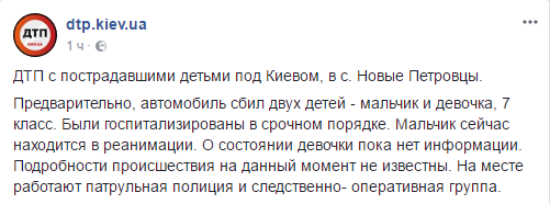 "ДТП с пострадавшими детьми под Киевом, в с. Новые Петровцы. Предварительно, автомобиль сбил двух детей - мальчика и девочку, 7 класс. Были госпитализированы в срочном порядке. Мальчик сейчас находится в реанимации", - говорится в сообщении.