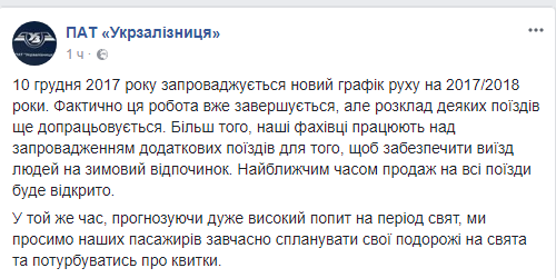 "10 декабря 2017 вводится новый график движения на 2017/2018 годы. Фактически эта работа уже завершается, но расписание некоторых поездов еще дорабатывается", – говорится в сообщении.