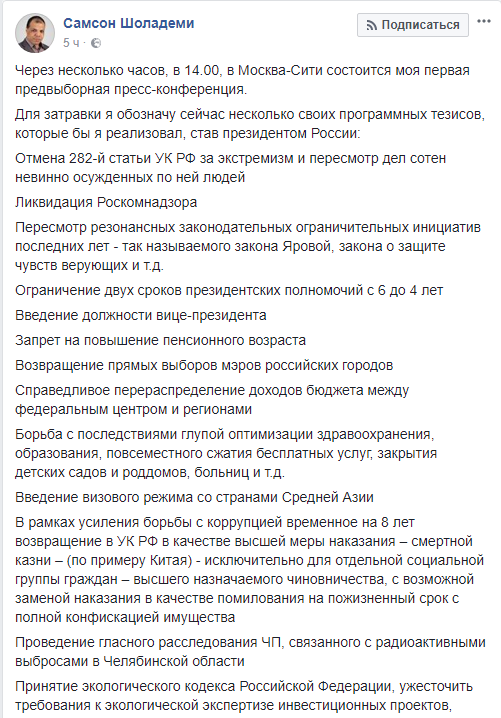 Московский бизнесмен и блогер Самсон Шоладеми, которые ранее объявил о своем участии в выборах президента России как самовыдвиженец, анонсировал в Facebook свою первую предвыборную пресс-конференцию.