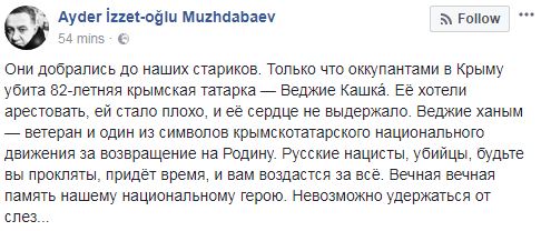 "Они добрались до наших стариков. Только что оккупантами в Крыму убита 82-летняя крымская татарка — Веджие Кашка. Ее хотели арестовать, ей стало плохо, и ее сердце не выдержало. Веджие ханым - ветеран и один из символов крымскотатарского национального движения за возвращение на родину. Вечная память нашему национальному герою. Невозможно удержаться от слез", - написал Муждабаев.