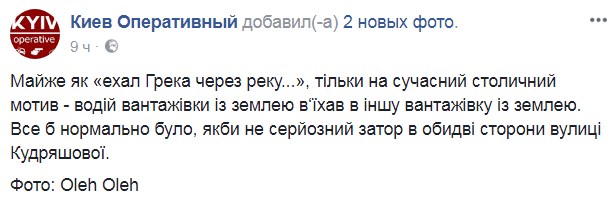 В Киеве произошло ДТП. Водитель грузовика с землей въехал в другой грузовик с землей. Из-за произошедшего образовалась большая пробка в обе стороны по улицу Кудряшова.