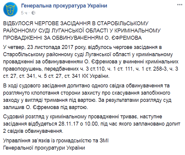 Он обвиняется в госизмене и действиях с целью изменения госграницы Украины, в организационном и другом содействии созданию и деятельности провозглашенной Луганской народной республики. Сам Ефремов вину не признает.