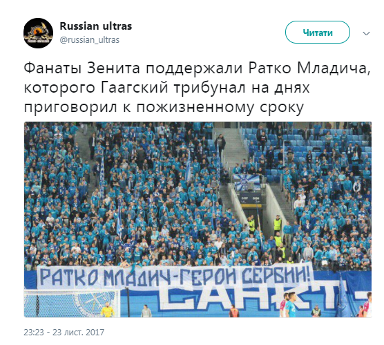 А в Питере, где "Зенит" принимал "Вардар" (2 - 1) ультрас вывесили политический плакат в поддержку Ратко Младича, которого Международный трибунал приговорил к пожизненному заключению.