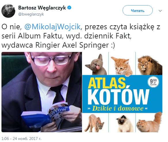 "Качиньский вот полагается на "Атлас котов" во время голосования в Сейме", - пишут они.