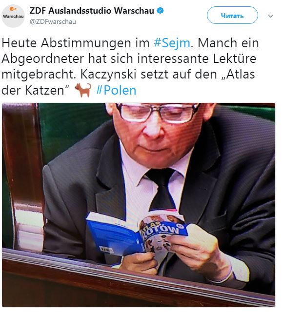 "Сегодня в Сейме состоится важное голосование по Верховному суду и Государственному судебному совету. Однако не все депутаты этим заинтересованы. Камеры выхватили момент, на котором глава партии "Право и справедливость" Ярослав Качиньский во время заседания читает "Атлас котов", - отмечает издание.