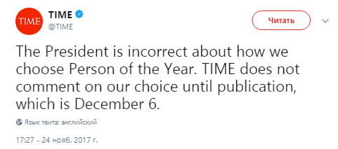 "Президент неверно понимает то, как мы выбираем человека года. Time не комментирует свой выбор до публикации, которая состоится 6 декабря", - говорится в сообщении Time в Twitter. Таким образом, в журнале опровергли возможность официального контакта от имени редакции с кандидатом на звание человека года.
