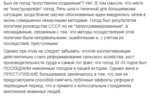 "Упоротый вышиватник расскажет вам, что плохие русские специально морили голодом украинцев, чтобы потом заселить их земли орками из-за Уральских гор. Упоротый совестливый либерал, особенно русский, скажет, что это кровавые большевики таким образом подавляли сопротивление крестьянства коллективизации - т.е. признает организованный и целенаправленный характер голода, но откажется видеть в нём "геноцидную" подоплеку, указав (вполне справедливо) что в то же время голод наблюдался и в местностях, украинцами не населенных. Наконец, упоротый неосталинист скажет, что голода вообще не было и это все западная пропаганда, а менее упоротый заявит, что голод был, но стал следствием неблагоприятных погодных условий…"