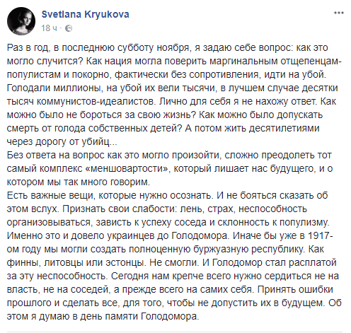 Светлана Крюкова, заместитель главного редактора "Страны": "Есть важные вещи, которые нужно осознать. И не бояться сказать об этом вслух. Признать свои слабости: лень, страх, неспособность организовываться, зависть к успеху соседа и склонность к популизму. Именно это и довело украинцев до Голодомора. Иначе бы уже в 1917-ом году мы могли создать полноценную буржуазную республику. Как финны, литовцы или эстонцы. Не смогли. И Голодомор стал расплатой за эту неспособность. Сегодня нам крепче всего нужно сердиться не на власть, не на соседей, а прежде всего на самих себя. Принять ошибки прошлого и сделать все, для того, чтобы не допустить их в будущем. Об этом я думаю в день памяти Голодомора".