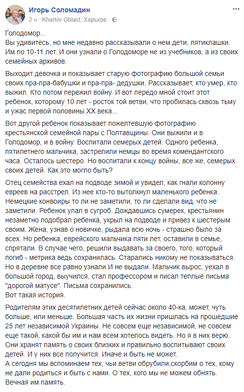 "Голодомор... Вы удивитесь, но мне недавно рассказывали о нем дети, пятиклашки. Им по 10-11 лет. И они узнали о Голодоморе не из учебников, а из своих семейных архивов.