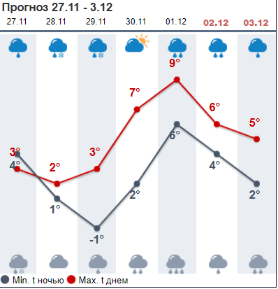 Сайт Weather.com обещает осадки практически всю неделю. В понедельник и среду со снегом. Также 30 ноября утром возможна ледяная изморось. Без осадков только в четверг, 29 ноября. Дневная температура +1...+4. Самым теплым днем недели станет суббота, когда потеплеет до +8.