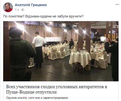Политик Анатолий Гриценко саркастично прокомментировал новость: "По понятиям? Ордена не забыли вручить?" Имея в виду, что нельзя было отпускать авторитетов.