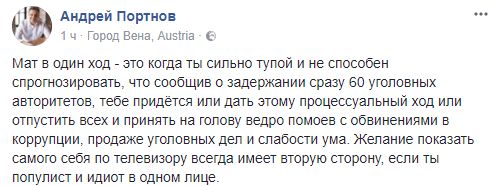 "Мат в один ход - это когда ты сильно тупой и не способен спрогнозировать, что сообщив о задержании сразу 60 уголовных авторитетов, тебе придется или дать этому процессуальный ход или отпустить всех и принять на голову ведро помоев с обвинениями в коррупции, продаже уголовных дел и слабости ума. Желание показать самого себя по телевизору всегда имеет вторую сторону, если ты популист и идиот в одном лице".