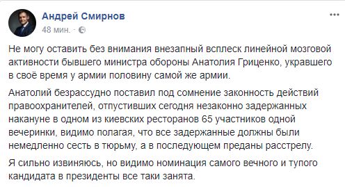"Не могу оставить без внимания внезапный всплеск линейной мозговой активности бывшего министра обороны Анатолия Гриценко, укравшего в свое время у армии половину самой же армии.