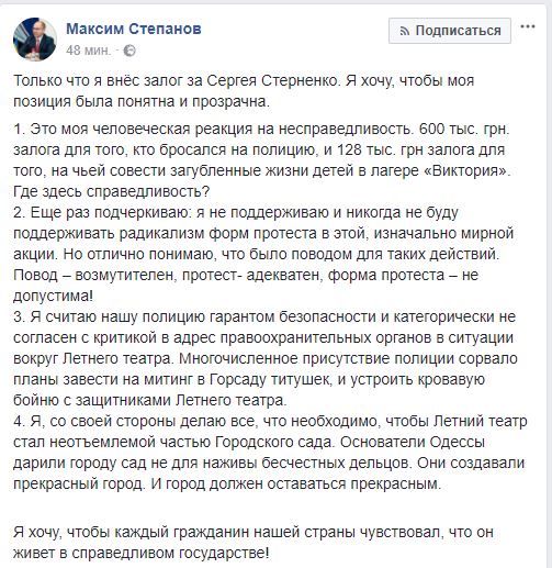 "Это моя человеческая реакция на несправедливость. 600 тыс. грн. залога для того, кто бросался на полицию, и 128 тыс. грн залога для того, на чьей совести загубленные жизни детей в лагере "Виктория". Где здесь справедливость?", - пишет Степанов.