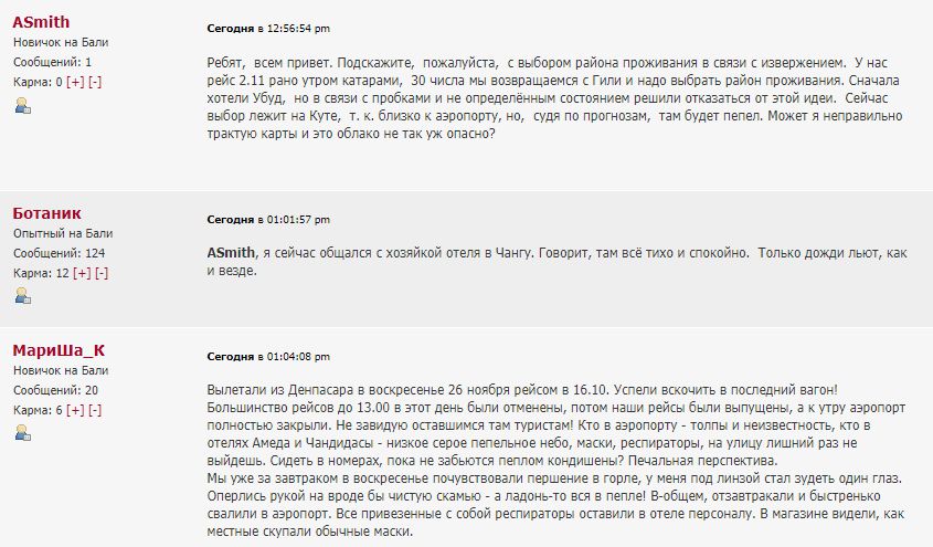 Также люди обсуждают, где какие погодные условия, где есть пепел, а где нет, и делятся, где можно купить респираторы, чтобы защититься от дыма. Туристы интересуются, когда можно лететь на Бали, другие пользователи им отвечают, что поведение вулкана предсказать невозможно