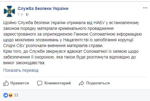 "Только что Служба безопасности Украины получила от НАБУ в установленном законом порядке материалы уголовного производства, зарегистрированного по обнародованной Анной Соломатиной информации о возможных злоупотреблениях в Нацагентстве по предотвращению коррупции", - пишет СБУ в соцсети Facebook.