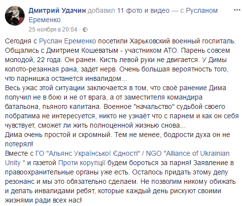 "Весь ужас этой ситуации заключается в том, что своё ранение Дима получил не в бою и не от врага, а от заместителя командира батальона, пьяного капитана. Военное "начальство" судьбой своего побратима не интересуется, никто не узнаёт что с парнем и как он себя чувствует, сможет ли жить полноценной жизнью снова...", - написал Удачин.