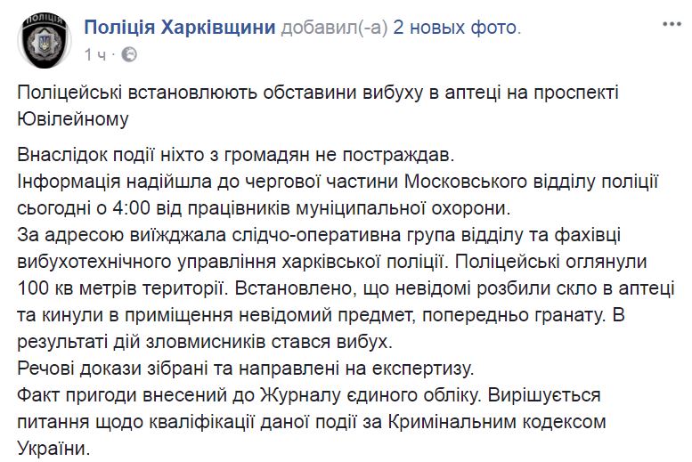 В Харькове сегодня рано утром неизвестные бросили гранату в аптеку на проспекте Юбилейном. Об этом сообщает полиция Харьковской области на странице в Facebook.