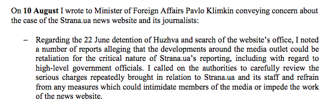 "Я призвал власти тщательно рассмотреть серьезные обвинения, неоднократно возникавшие в связи со Strana.ua и его персоналом, и воздерживаться от любых мер, которые могут запугать представителей средств массовой информации или препятствовать работе новостного сайта", - отметил Дезир.