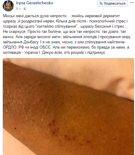 "Минск мне дается очень непросто. Какой-то нервный дерматит каждый раз, и раздерганные нервы. Несколько дней после - психологический стресс и псориаз от этого "коктейля общения", каждый раз бессонница и стресс... Не жалуюсь. Просто так больно, что все так непросто, так долго, тяжело. Но ради высокой цели - освобождения ребят и продвижения мира, освобождения Донбасса. И я не знаю, честно, с кем общение тяжелее с ОРДЛО, РФ или иногда ОБСЕ. Но мы победим, потому что правда за нами, а мотивация - Украина!" - написала Геращенко.
