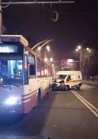 "На пр. Григоренко, 29-й микрорайон, около пяти утра в стоявший троллейбус врезалась машина скорой помощи.