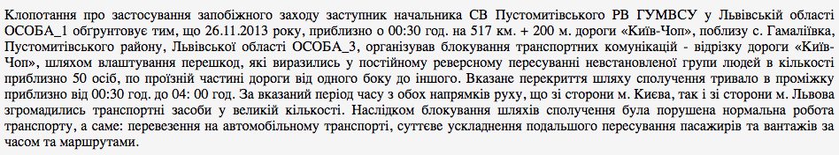 Такую меру пресечения в виде личного обязательства Труба обосновывал тем, что Шевцив в составе группы из 50 человек в районе села Гамалиевка Пустомитовского района Львовской области в ночь на 26 ноября 2013 года организовал блокирование трассы "Киев-Чоп".
