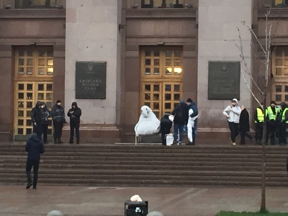 К зданию Киевской госадминистрации на Крещатике уже принесли памятник "Ждуна коммунальных услуг". Об этом сообщил в Twitter журналист Сергей Андрушко, опубликовав соответствующее фото.